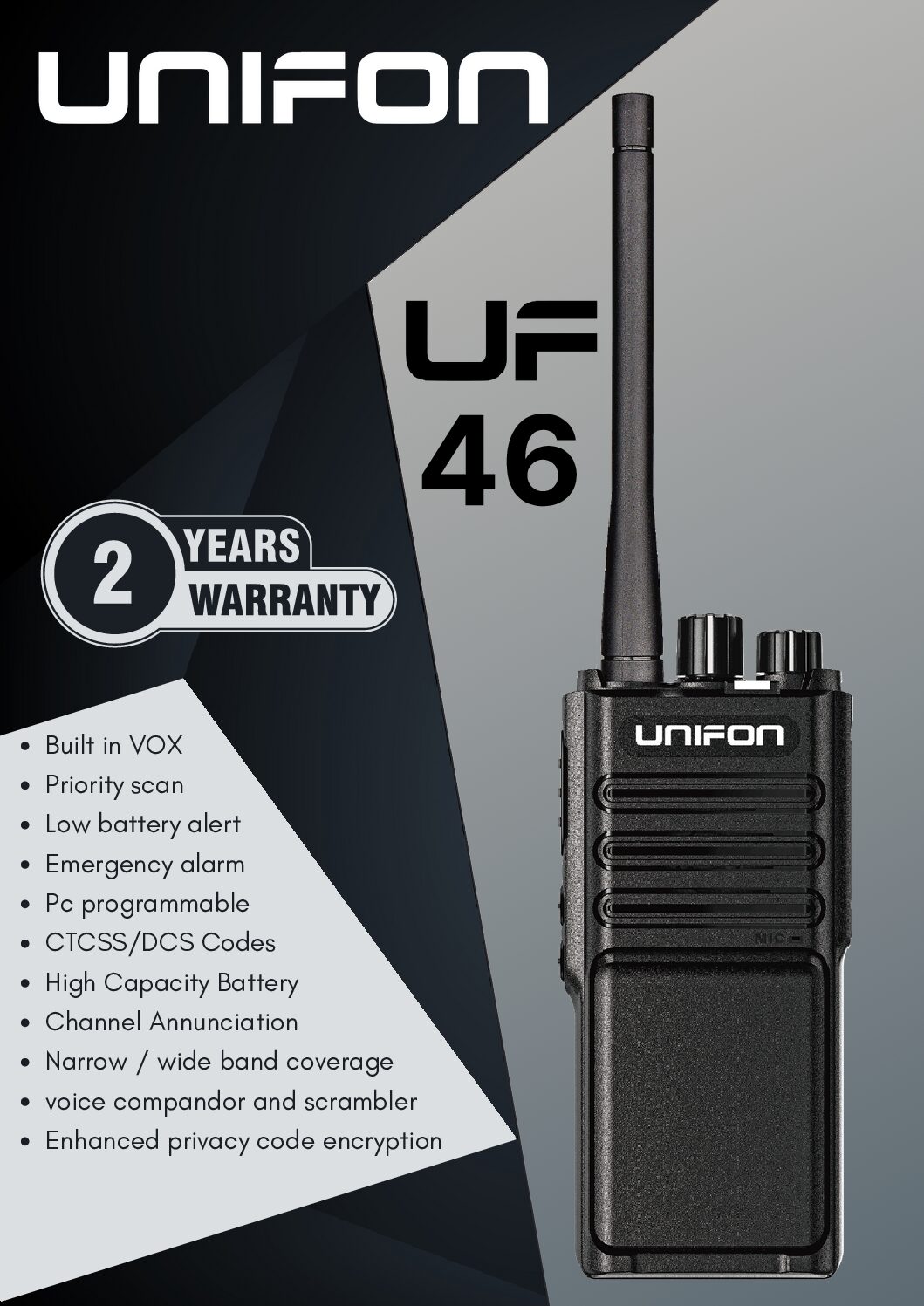 The Unifon UF46 is a durable and high-performance walkie talkie designed for reliable long-range communication. Built a rugged body and strong signal reception, it is ideal for security teams, construction sites, warehouses, hotels, events and industrial use.It comes a powerful antenna, clear audio output, and easy-to-use controls for seamless communication.
